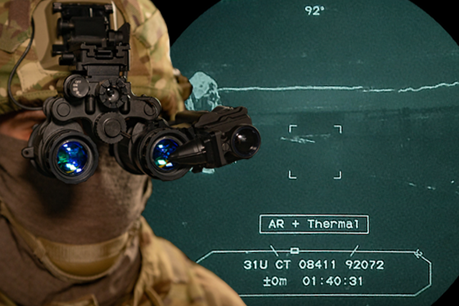 Mission data is displayed by the Thermoteknix ClipIR XD – a thermal imaging clip-on device mounting on an NVG, providing not only augmented reality data but also thermal imaging fusion. The system provides heads-up navigation and tracking of friendlies, using GPS and digital terrain elevation data (DTED) to deliver accurate visualisation of geo-spatial information.